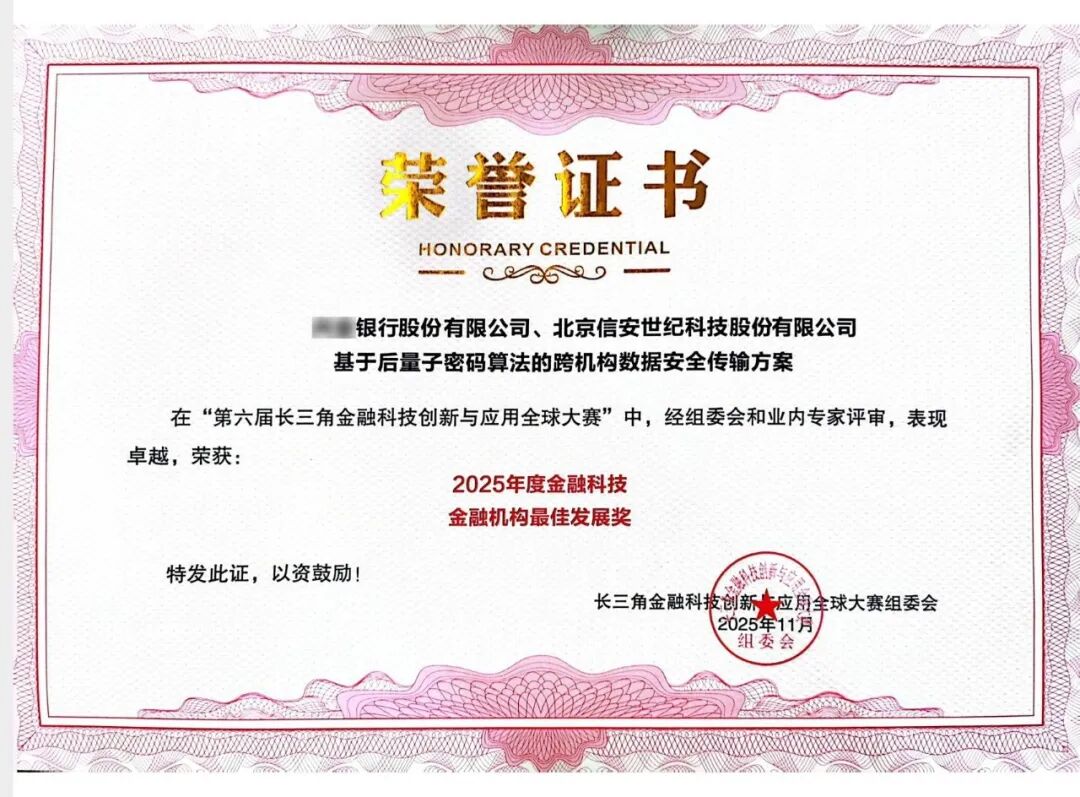 近日,北京信安世纪科技股份有限公司(股票代码:688201)与某股份制银行联合申报的“基于后量子密码算法的跨机构数据安全传输方案”,在“第六届长三角金融科技创新与应用全球大赛”中表现卓越,荣获2025年度金融科技“金融机构最佳发展奖”。