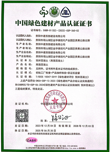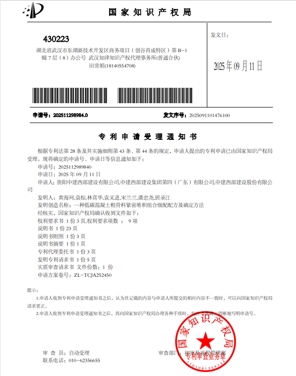 在低碳技术研发与应用领域,贵阳厂以固废高值化利用和工艺革新为抓手,实现降碳成效量化落地。全年可消纳粉煤灰1.8万吨以上、矿粉7000吨以上,通过多元固废协同配比技术,大幅降低水泥用量,从源头减少碳排放;在生产工艺创新上,《一种低碳混凝土粗骨料紧密堆积组合级配配方及确定方法》发明专利已进入受理阶段,该技术将进一步优化混凝土配比体系,实现低碳与高性能的双向提升。同时,贵阳厂深耕工业固废材料应用研究,开展《复合粉应用技术研究》课题攻关,持续探索固废替代的技术边界,为行业低碳技术升级提供创新范本。